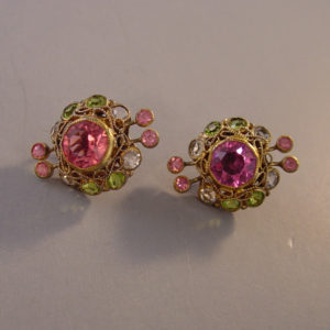 HOBE earrings in unfoiled purple, pink and clear unfoiled rhinestones set in hand made gilt wire work