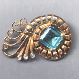 REINAD retro large flower and ribbons brooch with brilliant blue and clear rhinestones