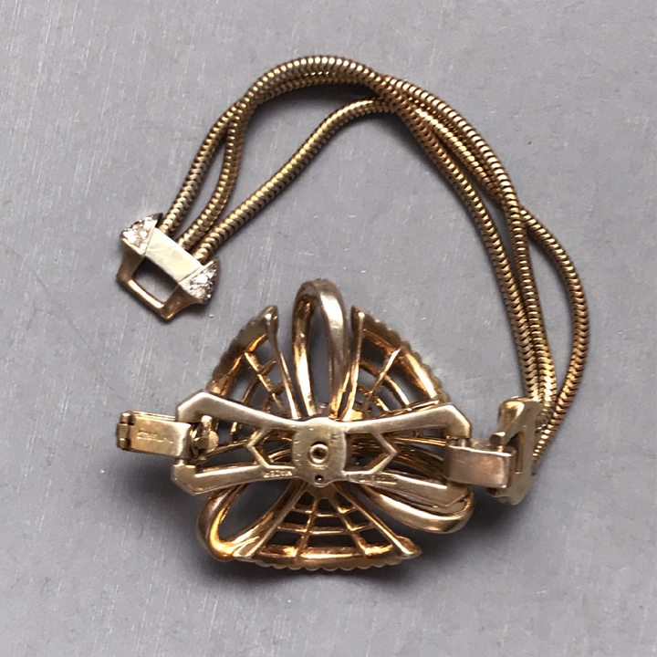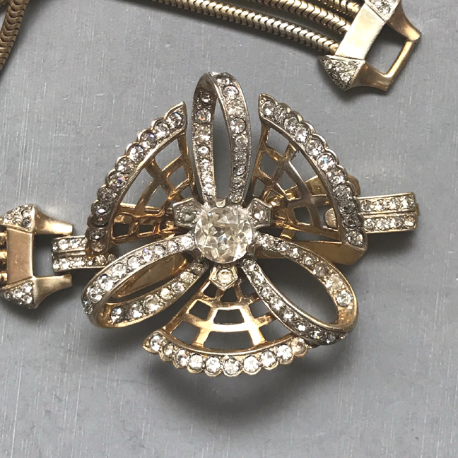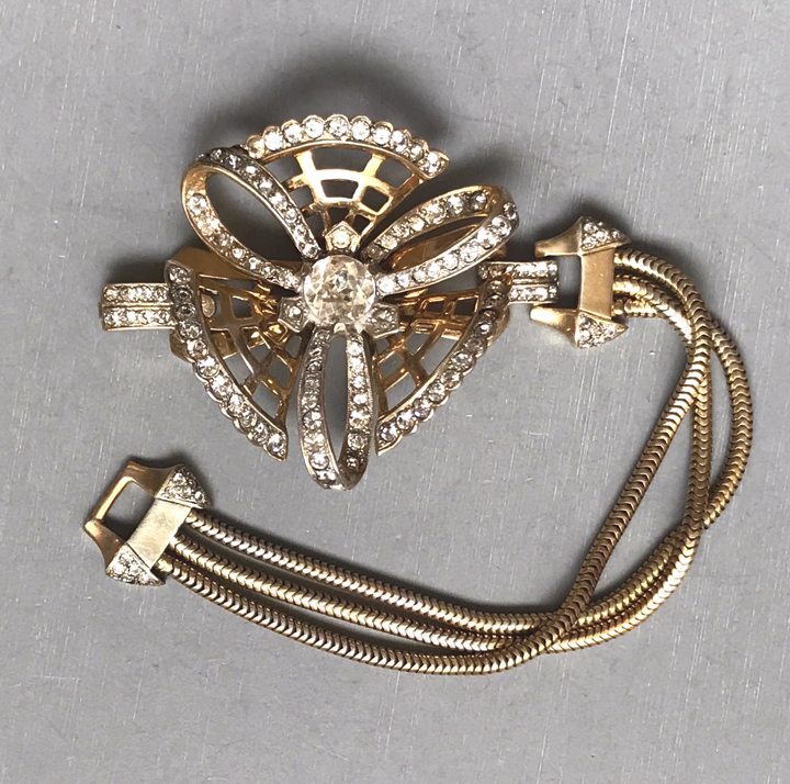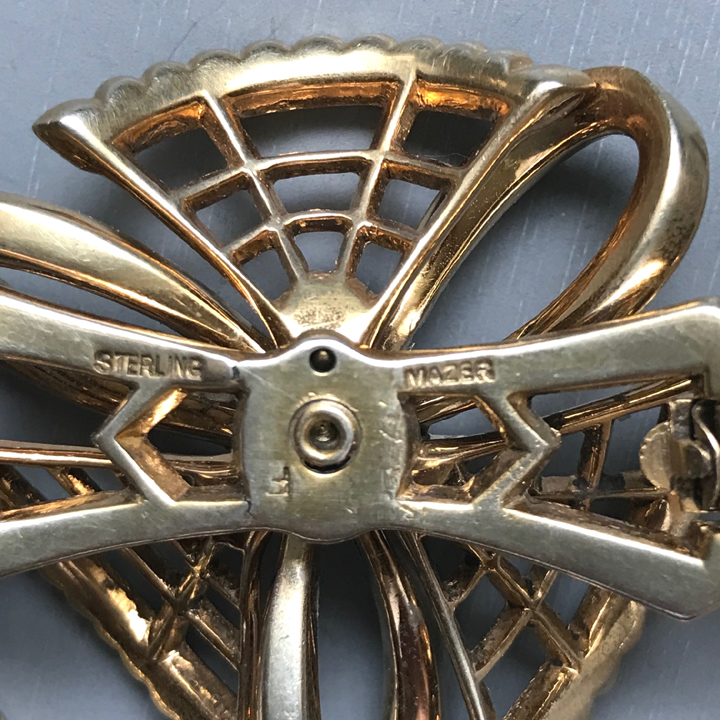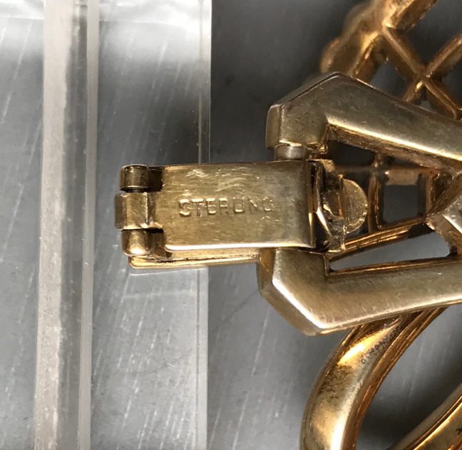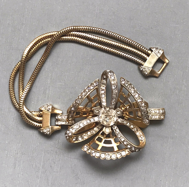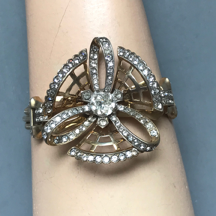 MAZER well designed flower bracelet with brilliant clear rhinestones in a gold plated sterling silver setting, 1940sProduct #42919 All items in excellent vintage condition unless otherwise noted.