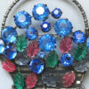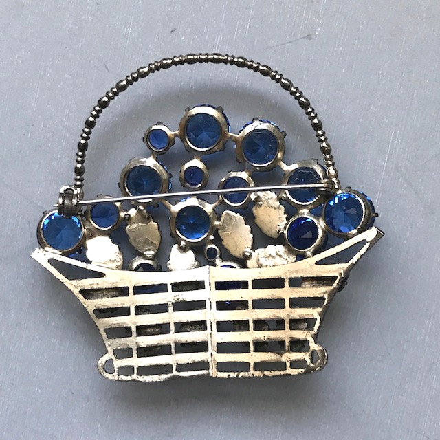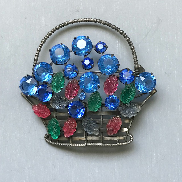 CZECH basket brooch with colorful and unusual stones including green, rose and blue pressed glass leavesView View Product #41828 All items in excellent vintage condition unless otherwise noted.