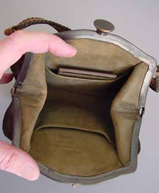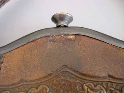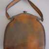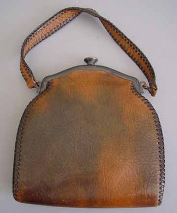 PURSE Arts & Crafts leather purse with four flowers and leaves, 5-3/4" by 6". There is lacing around the purse and the handle. There is also a small leather tab at the closure that is missing, but it does not affect usability or looks. This page from the 1932 "Denver Jeweler's Buyer's Guide" shows a selection of similar Mastercraft purses of the same era. ViewViewView