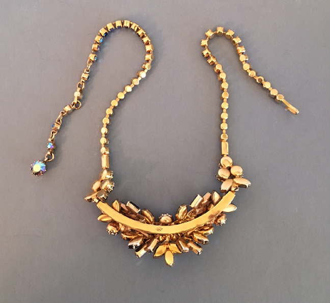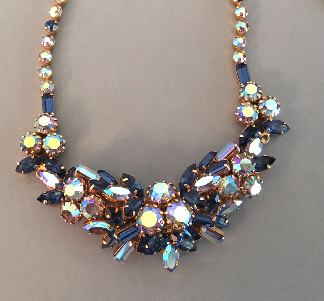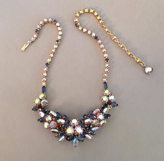 AUSTRIA Schoffel blue rhinestones and aurora borealis necklaceThis was made in the 1960s, signed on the back only with the Austria crown mark, which is the mark for the Schoffel Company who made jewelry from the 1930s to the 1960s. It is in excellent condition in every way, is absolutely brilliant. View View View Product #X39689 All items in excellent vintage condition unless otherwise noted.