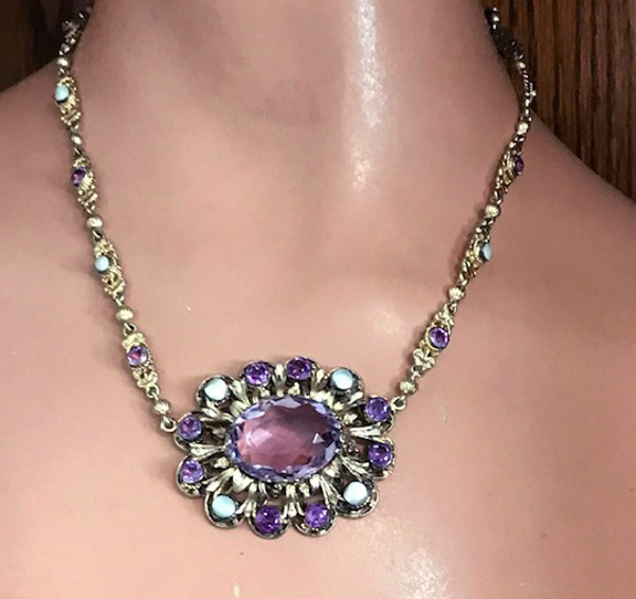 AUSTRO-HUNGARIAN genuine AMETHYST Renaissance inspired necklace with mother-of-pearl accents in a gold plated silver settingIt has the boar's head hallmark on the clasp as well as the mark "<12", the meaning of which we do not know. It is 16" wearable length with a center element of 2" by 1-5/8". There is a nice layered leaf design along with other designs, and the decoration runs all the way up to the clasp. It is typical of this type of jewelry that it has precious stones set in gold plated silver. View View View View View View View View View Product #42298 All items in excellent vintage condition unless otherwise noted.