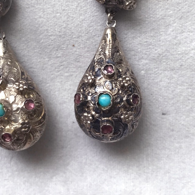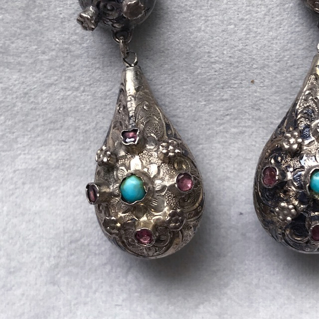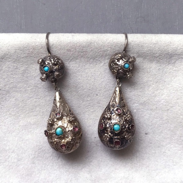 AUSTRO-HUNGARIAN Renaissance inspired turquoise and garnets earrings in an 800/1000 silver settingThe silver has lovely designs on all the sides, and the two pieces on each earring allows extra movement. View View View Product #42296 All items in excellent vintage condition unless otherwise noted.