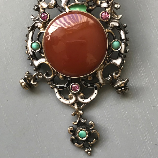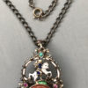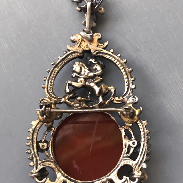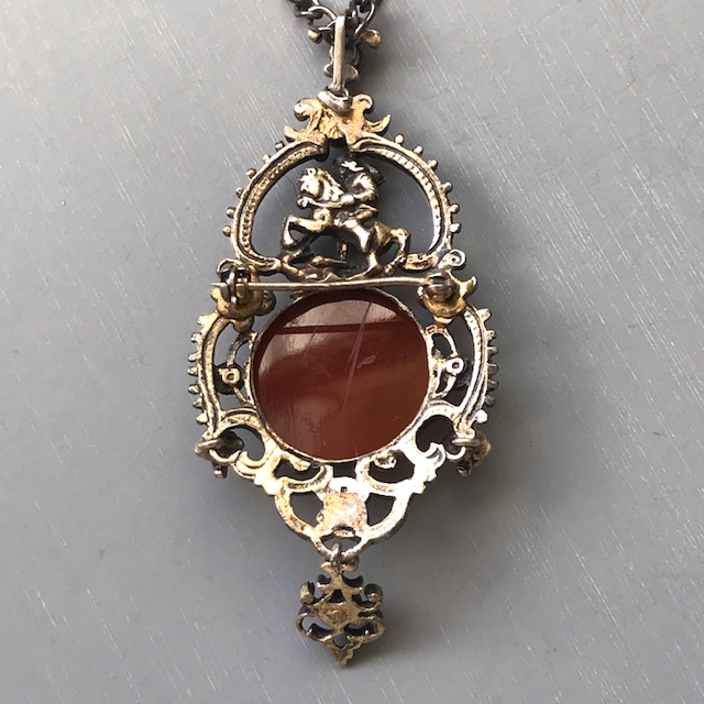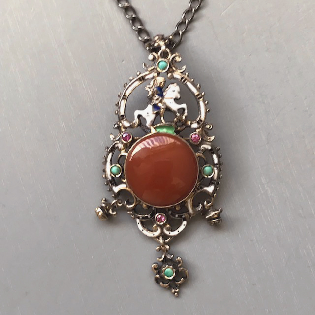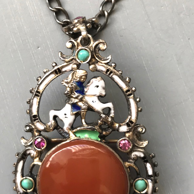 AUSTRO-HUNGARIAN St. George and the Dragon necklace and pin combination with a smooth oval agate center with turquoise, pink stones and enamelingGeorge and the Dragon necklace and pin combination with a smooth oval agate center with turquoise, pink stones and enameling around, all set in 800-900 silver. Renaissance Revival in style, the enamel is in white, black and green and some is missing here and there upon close examination. The chain is 900 silver and it is 16" long and the pendant is 2-3/4" by 1-1/3". You can go to Wiki to read more about St George, a very interesting character in history. View View View View View Product #42046 All items in excellent vintage condition unless otherwise noted.