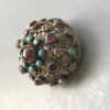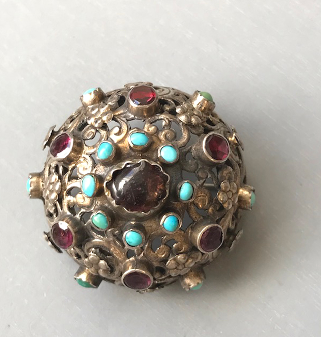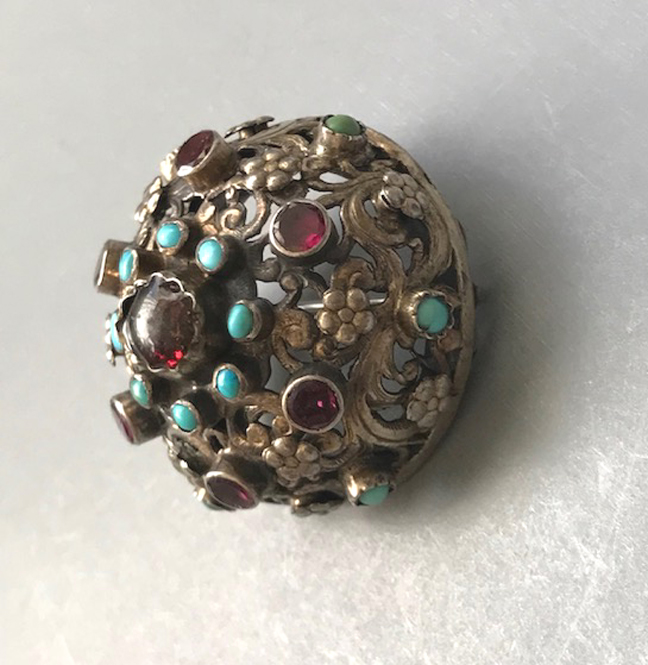 DescriptionAUSTRO-HUNGARIAN Victorian antique brooch with garnets, turquoise and one center garnet colored stone that is glass in an irregular cut. It has a mark that dates it to 1867-1872 and it tests as 800-900 silver. The settings are raised over a dome-shaped sphere with pierced designs. Little flowers raised above the scrolls in the metal add wonderful detail to this piece. The center stone is glass and the others are garnets.