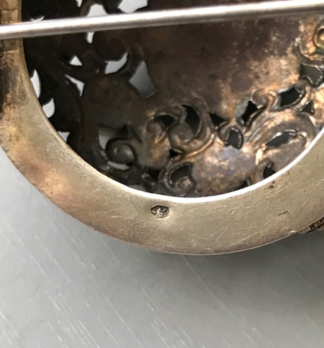 Renaissance Revival in style, there is a very tiny hallmark on the back, too tiny for me to read, and it has the antique style tube and c-clasp closure where the pin extends a bit beyond the brooch edge. It is 2-1/3" wide and stands 7/8" high.