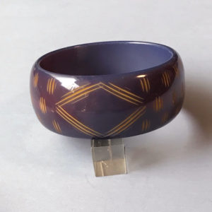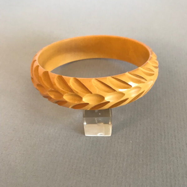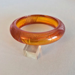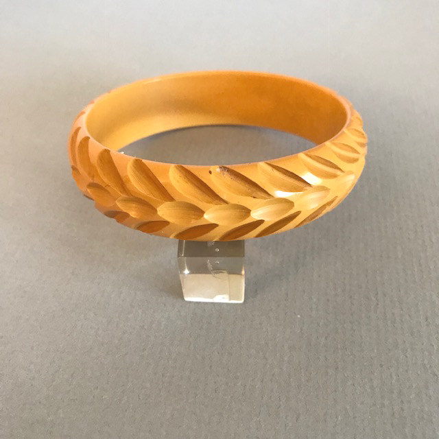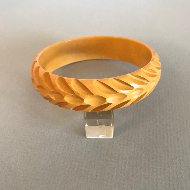 DescriptionBAKELITE bangle in butterscotch with a slash carved tracks design, 2-1/2" by 7/8" by 1/4". View Product #66767