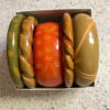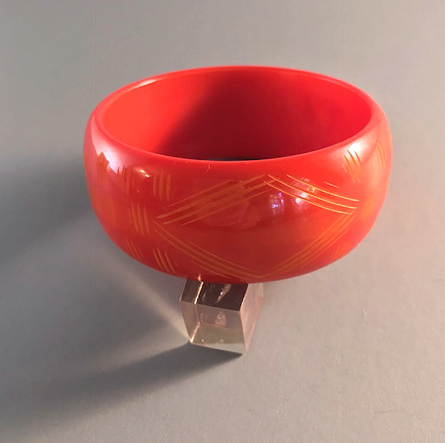 BAKELITE bangle in citrus orange cut back to butterscotch in finely carved slash linesThe last two photos show this bangle with others, shown just for fun and not included in the price. View View View View Product #40475 All items in excellent vintage condition unless otherwise noted.