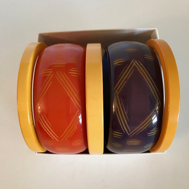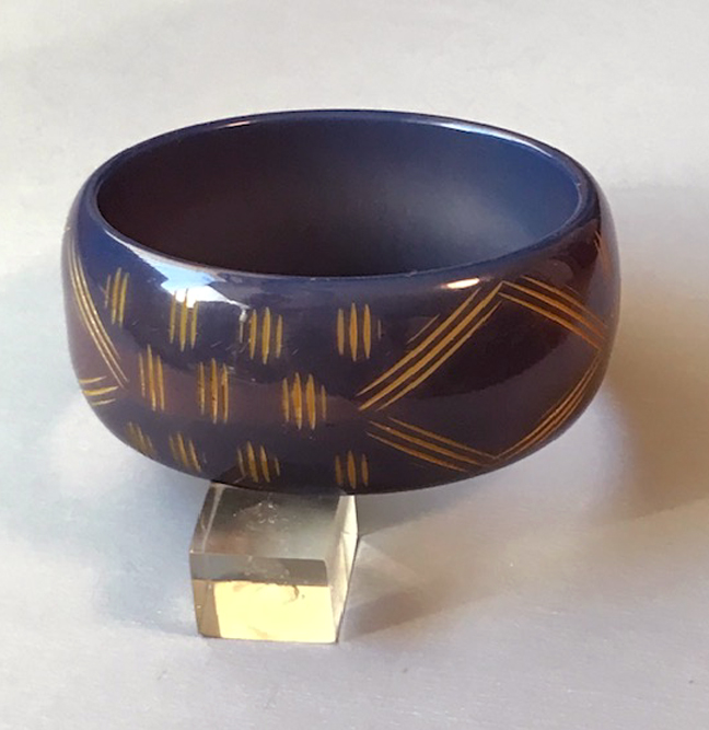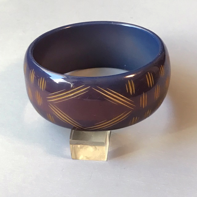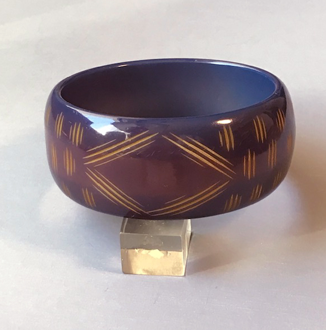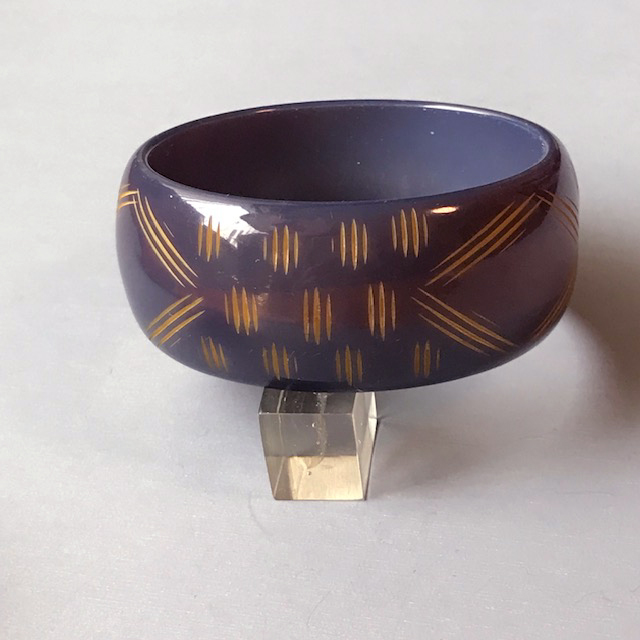 BAKELITE bangle in eggplant purple cut back to butterscotch in finely carved slash linesView View View View Product #40543 All items in excellent vintage condition unless otherwise noted.