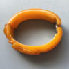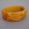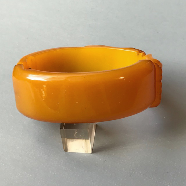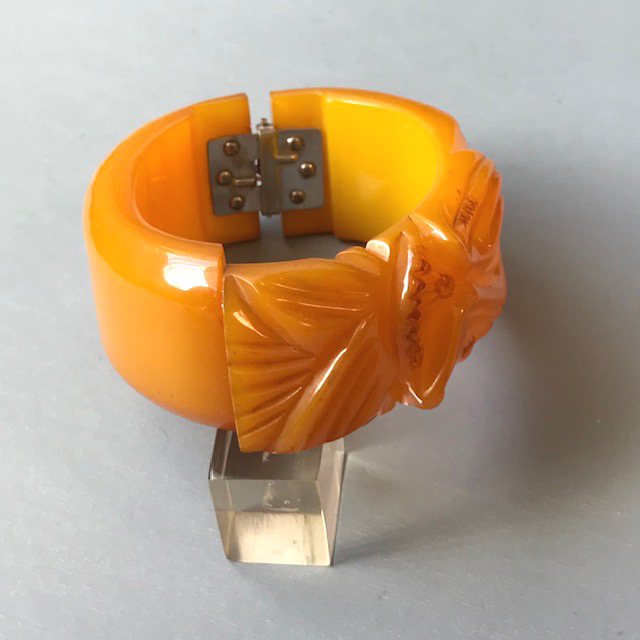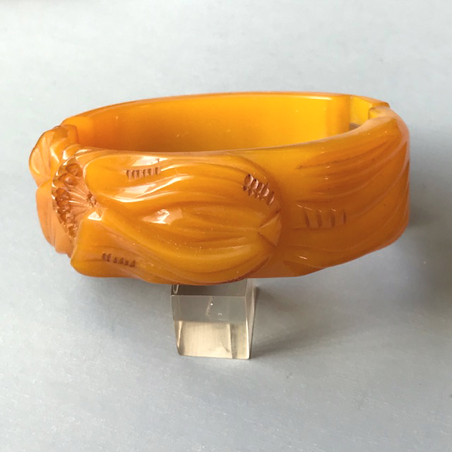 Description BAKELITE butterscotch flower carved hinged clamper bangle, 6-1/2" by 1" by 1/3". Beautifully carved in about 1940 and the perfect bangle for a smaller wrist. View View View View Product #B35531