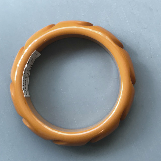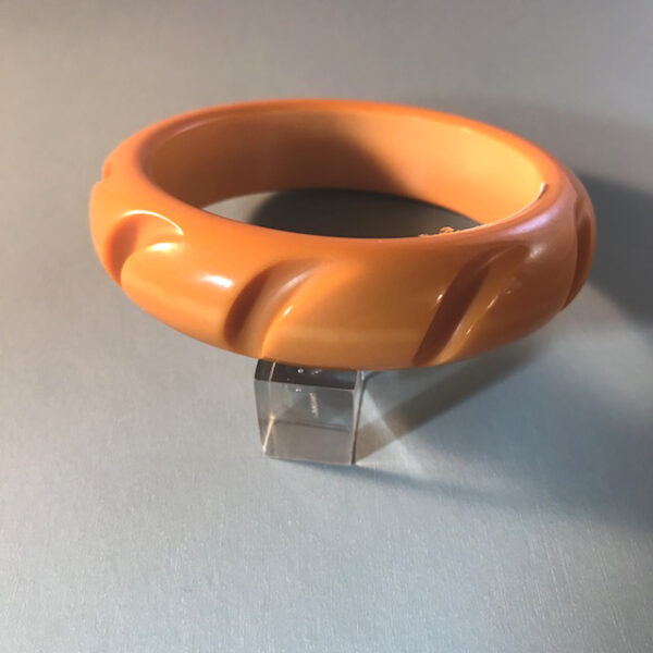 Description BAKELITE chunky peachy butterscotch bangle with a repeating slash carved design all the way around, 2-1/2" by 3/4" by 1/3". View View Product #64497
