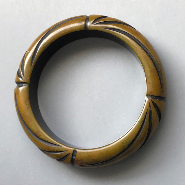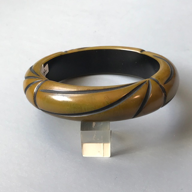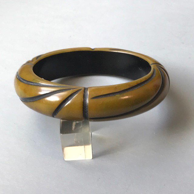 BAKELITE chunky marbled bamboo and black line carved and over dyed bangleProduct #40720 All items in excellent vintage condition unless otherwise noted.