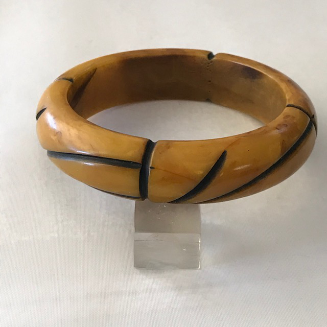 BAKELITE chunky marbled bamboo and black line carved and over dyed bangleProduct #40720 All items in excellent vintage condition unless otherwise noted.