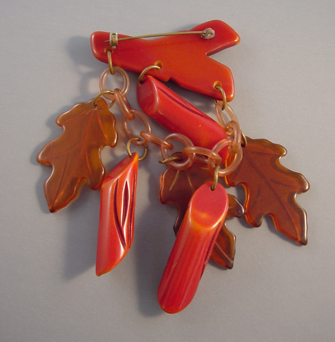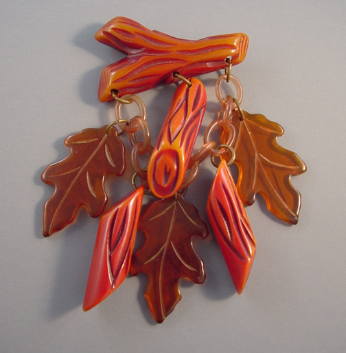 BAKELITE logs and leaves brooch circa 1940, over dyed butterscotchThis piece is in the book "Collecting Art Plastic Jewelry" by Leigh Leshner on page 59. View Product #B66024 All items in excellent vintage condition unless otherwise noted.