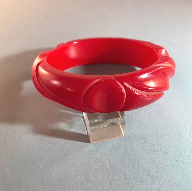 Description BAKELITE red bangle with leaf and thumbprint carved designs, 2-1/2" by 3/4" by 1/3".