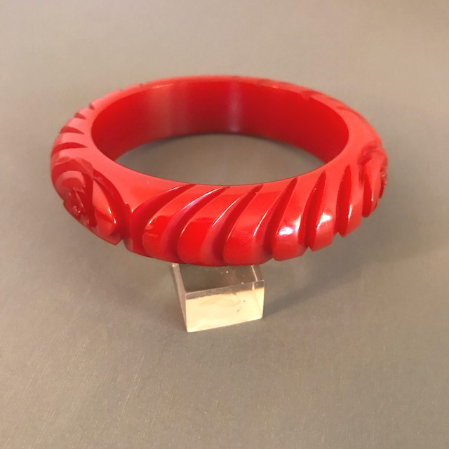 BAKELITE red pinwheel and flower carved bakelite bangleProduct #40418 All items in excellent vintage condition unless otherwise noted.