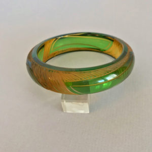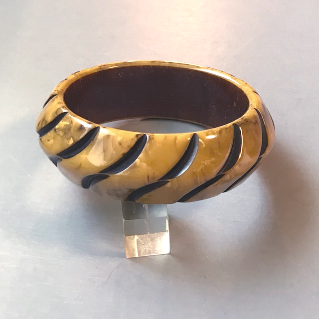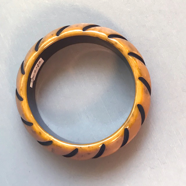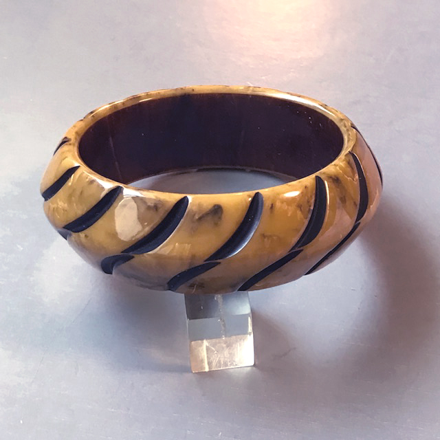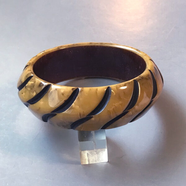 BAKELITE saucer shaped bangle in Mississippi mud color with wide slash carving and black over dyeProduct #41680 All items in excellent vintage condition unless otherwise noted.