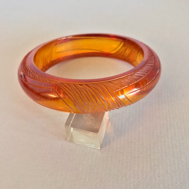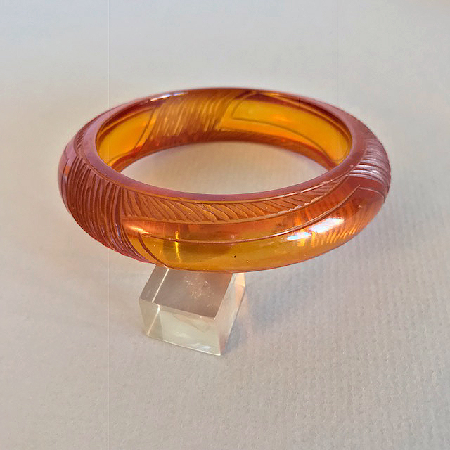 BAKELITE transparent apple juice bangle with slight orange tints and carved designs on the outsideView View Product #40726 All items in excellent vintage condition unless otherwise noted.