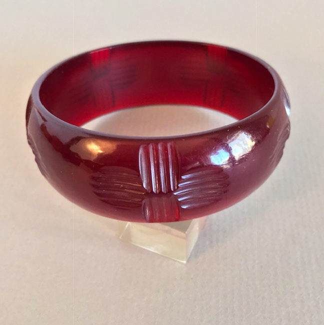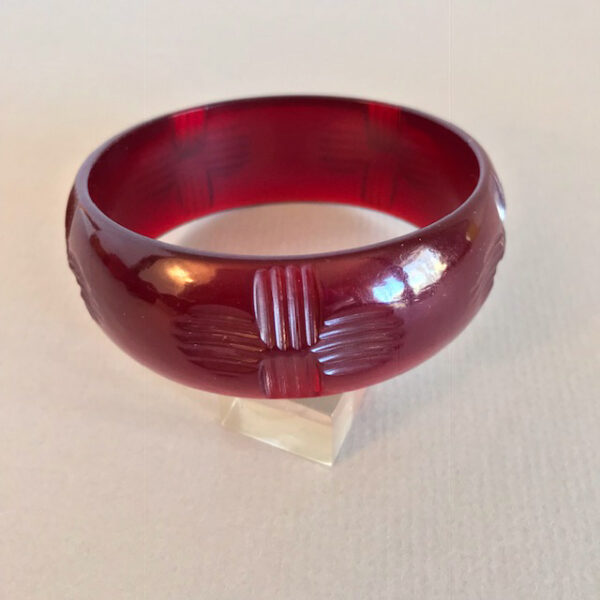 BAKELITE translucent black cherry juice red bangle with a Zia sun carved designProduct #B40308 All items in excellent vintage condition unless otherwise noted.