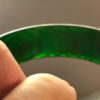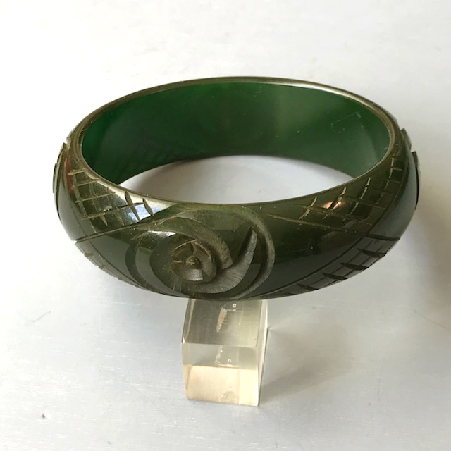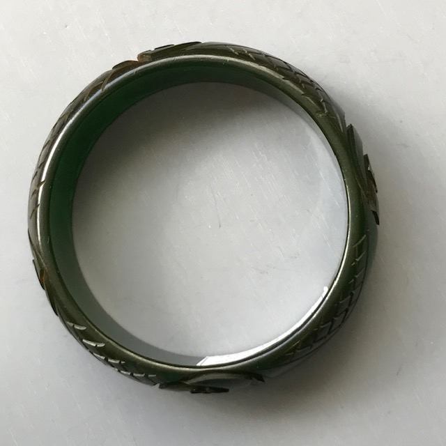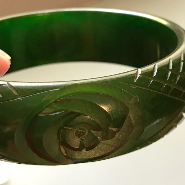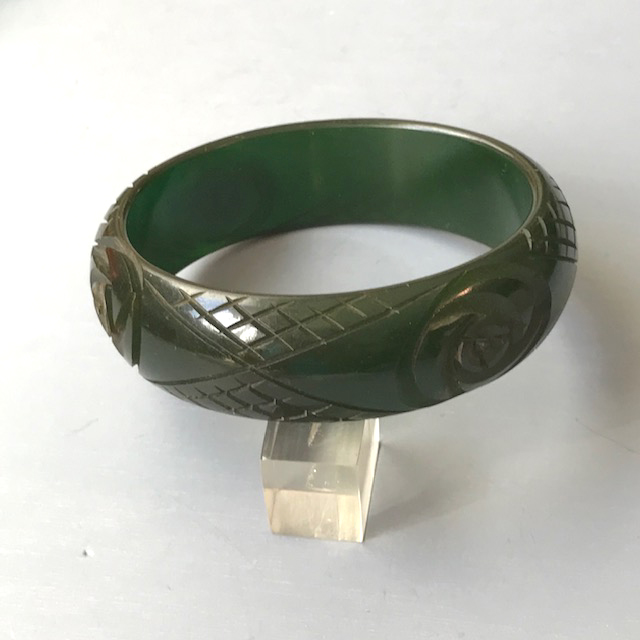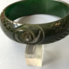 BAKELITE translucent green bangle with slash carved roses and diagonalsProduct #64960 All items in excellent vintage condition unless otherwise noted.