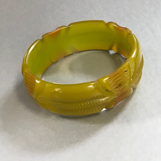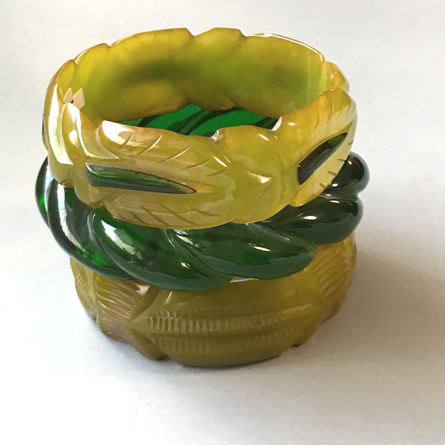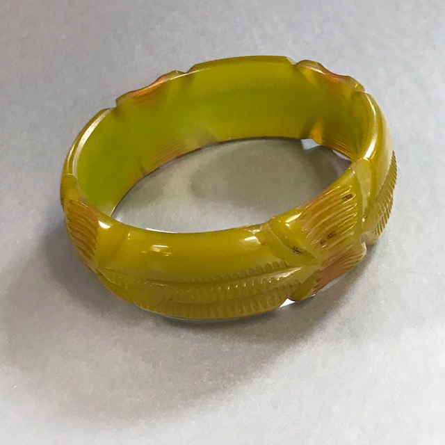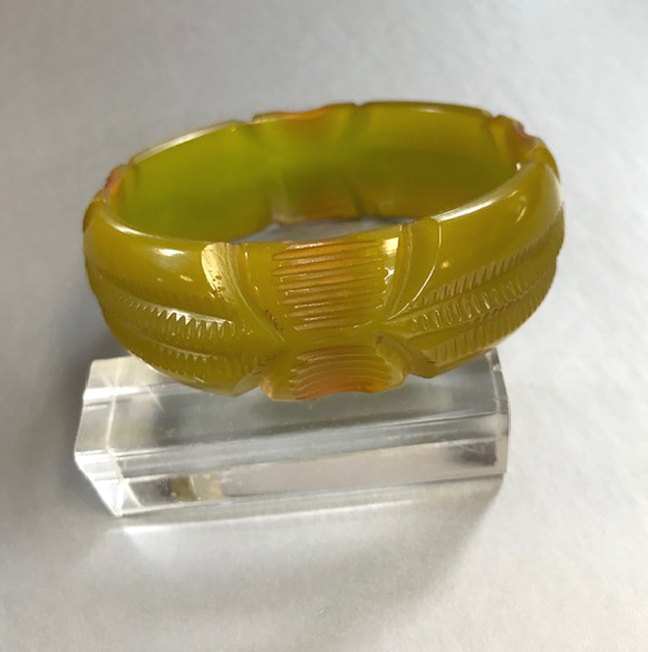 BAKELITE translucent green carved bangle that has peach colored tints at the edgesThe last two photos ways to stack this with other bangles, shown just for fun. View View View View View Product #41306 All items in excellent vintage condition unless otherwise noted.
