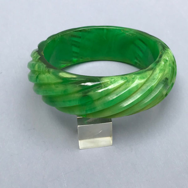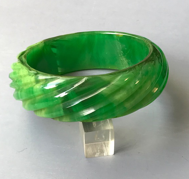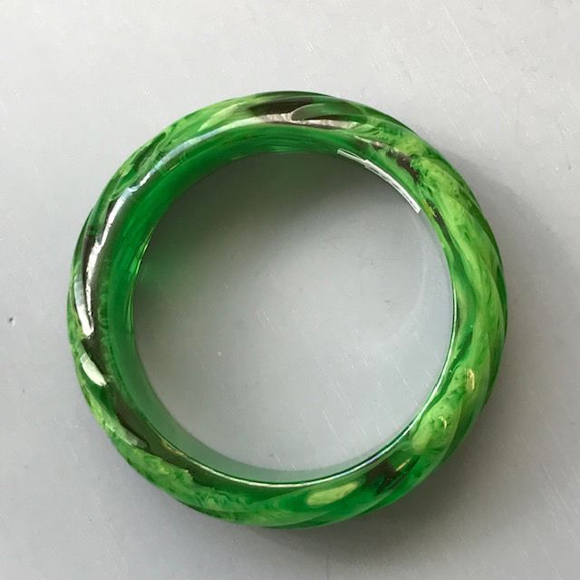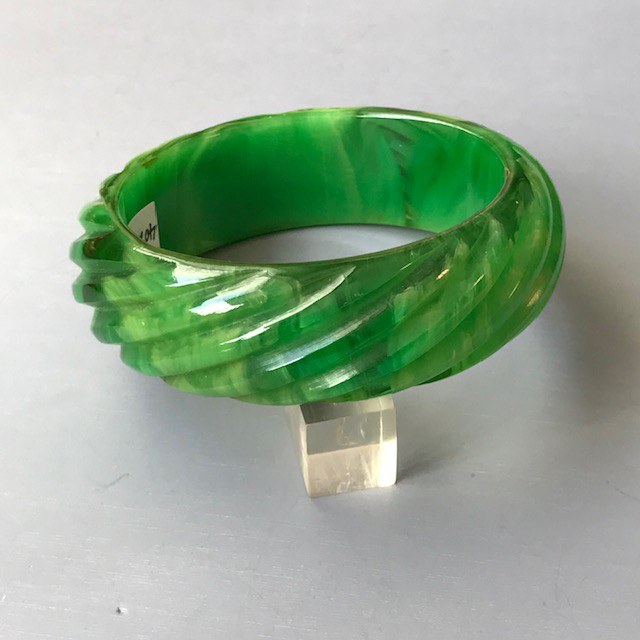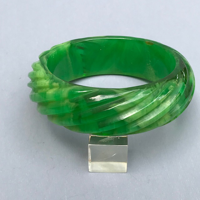 Description BAKELITE translucent marbled frosty mint green rope carved bangle with very interesting marbling, 2-5/8" by 7/8" by 1/3" wide.  What a wonderful and unusual color!   View
