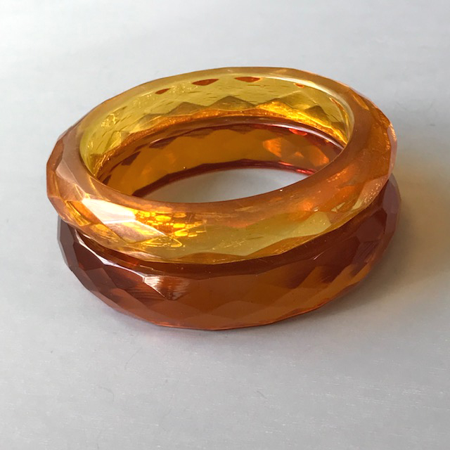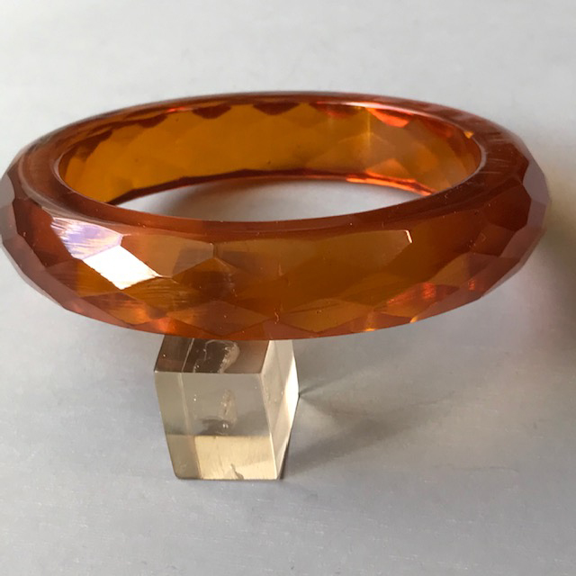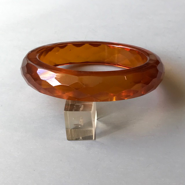 BAKELITE transparent iced tea color faceted bangleBAKELITE transparent iced tea color faceted bangle, 2-1/2" by 5/8" by 3/8". The last photo shows this with an apple juice bangle, shown here just for the fun of seeing how well this bangle stacks with others. View View View View Product #24331 All items in excellent vintage condition unless otherwise noted.