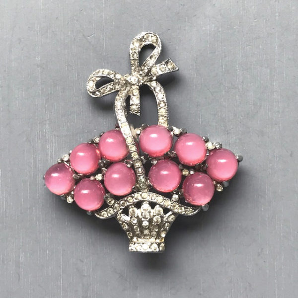 CORO basket brooch with petal pink glass moonglow cabochons and clear rhinestones and with a cheerful bow on the basket handle