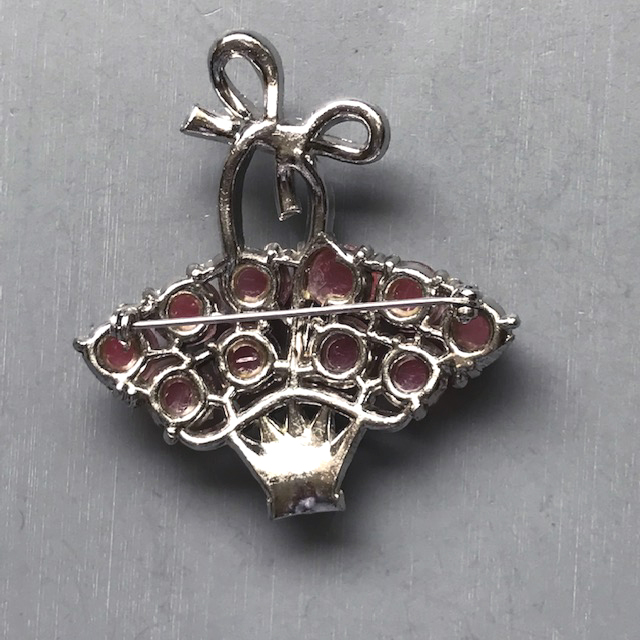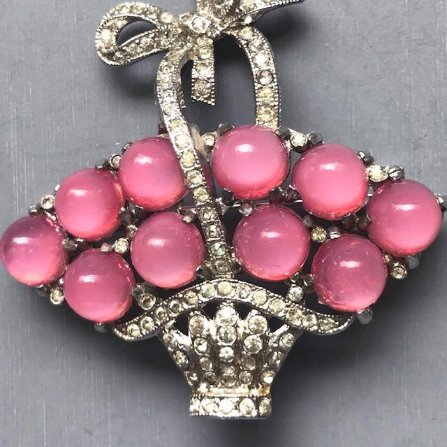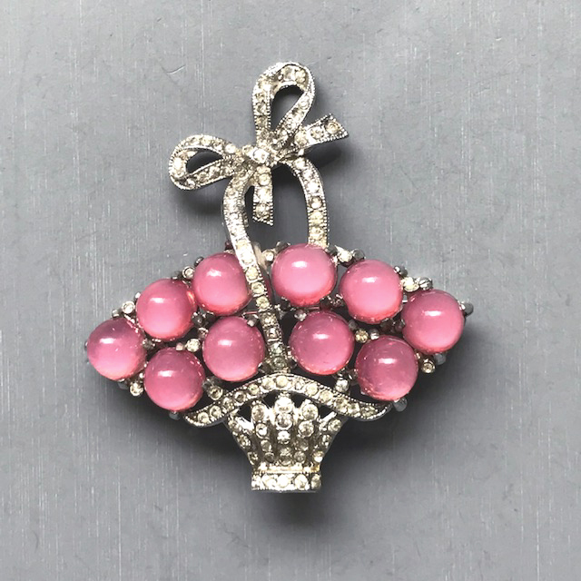 Description CORO basket brooch with petal pink glass moonglow cabochons and clear rhinestones and with a cheerful bow on the basket handle, all in a silver tone setting, 2-1/2" by 2-1/8".  While it is not signed, this is a Coro basket sold in 1940, 1941 and 1947 and 1942 they did an an enamel version, likely due to the limited rhinestones available.  The rhinestones in this brooch are brilliant and clear.  The last photo is a Coro advertisement from 1940 for this "Basket of flowers… softly glowing Satinore fruit in pink or blue with flashing white rhinestones."  View View