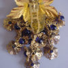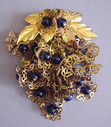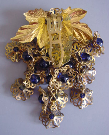DescriptionGOLD TONE leaves dress clip with deep blue glass beads and filigree florets, circa 1940, 3-1/2". It's intricate and fun to wear, with nice movement, and in very good vintage condition. View Product #Y23961