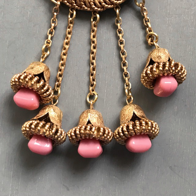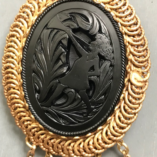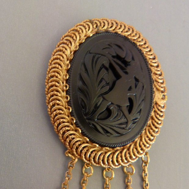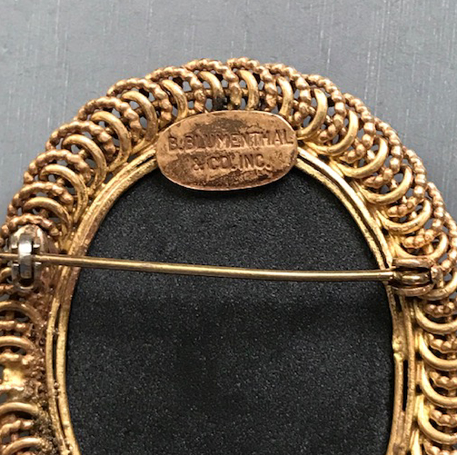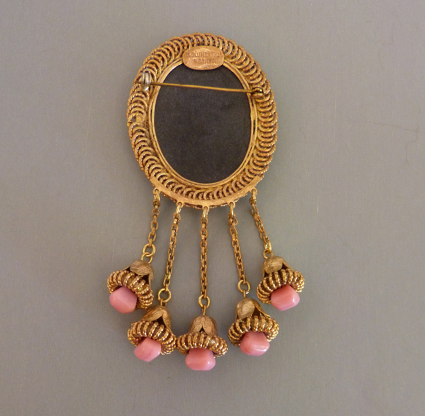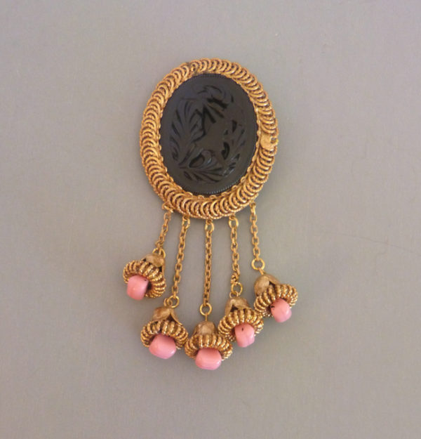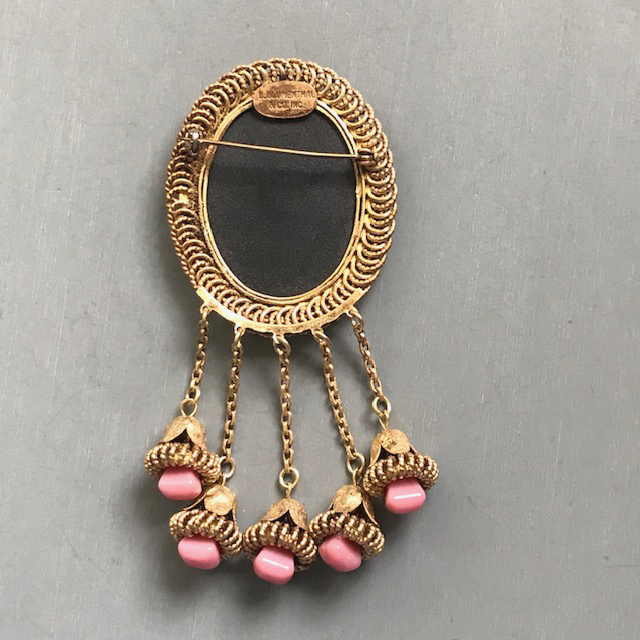 BLUMENTHAL & Co Inc pink and black brooch with a molded glass sceneProduct #X65166 All items in excellent vintage condition unless otherwise noted.