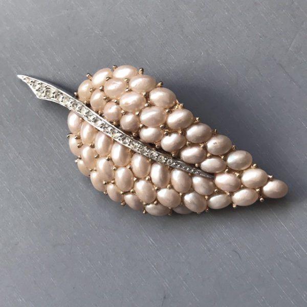 BOUCHER lovely leaf brooch made of glass pearls with a vein of brilliant clear rhinestonesProduct #42116 All items in excellent vintage condition unless otherwise noted.