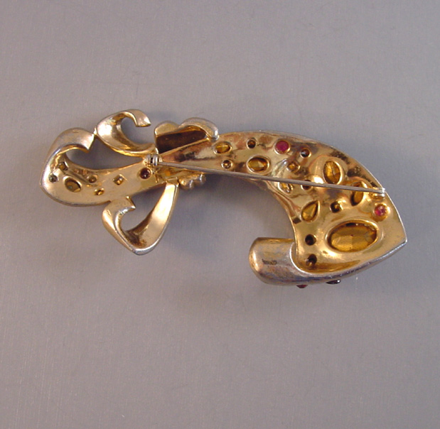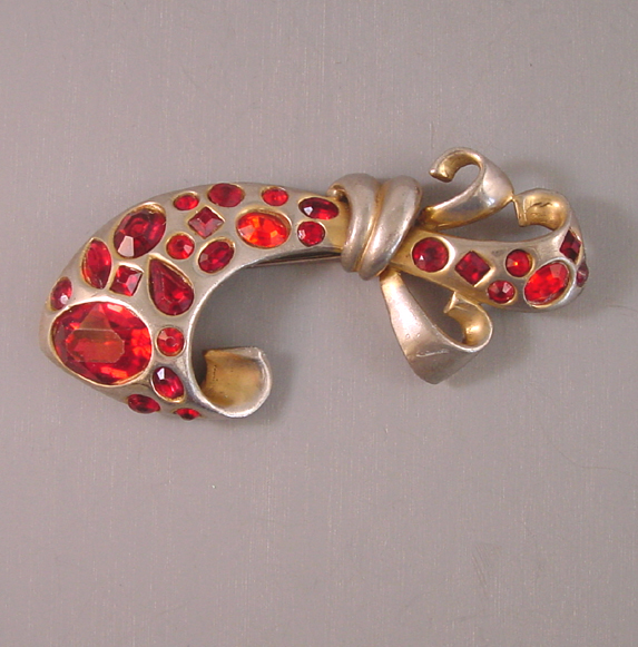 DescriptionBOW large red rhinestone stylized bow brooch with wonderful design, circa 1940s. It is a larger size at 3-1/2" by 1-1/2". This has two different shades of red stones for variety and is set in a lightly gilt setting with some of the gilt worn off on the front. There is also a scratch on the bow curl that isn't visible except under close examination. It's a lovely design.