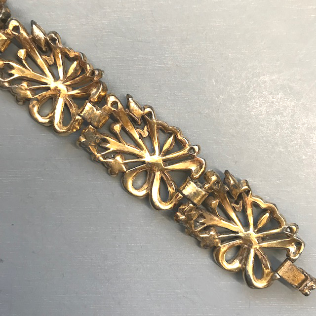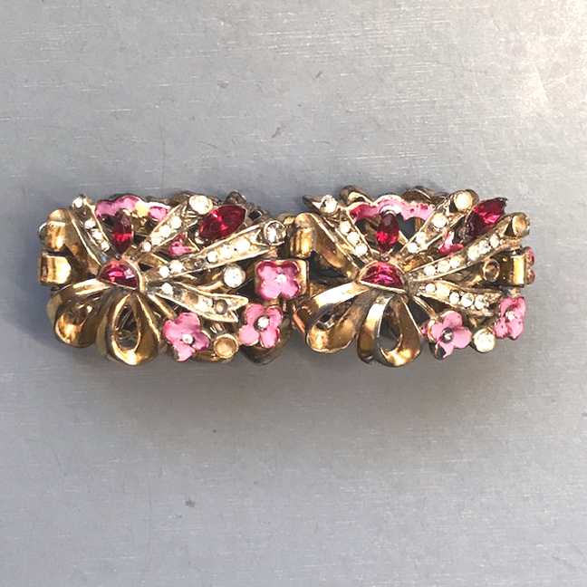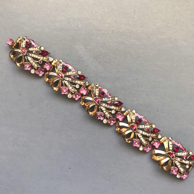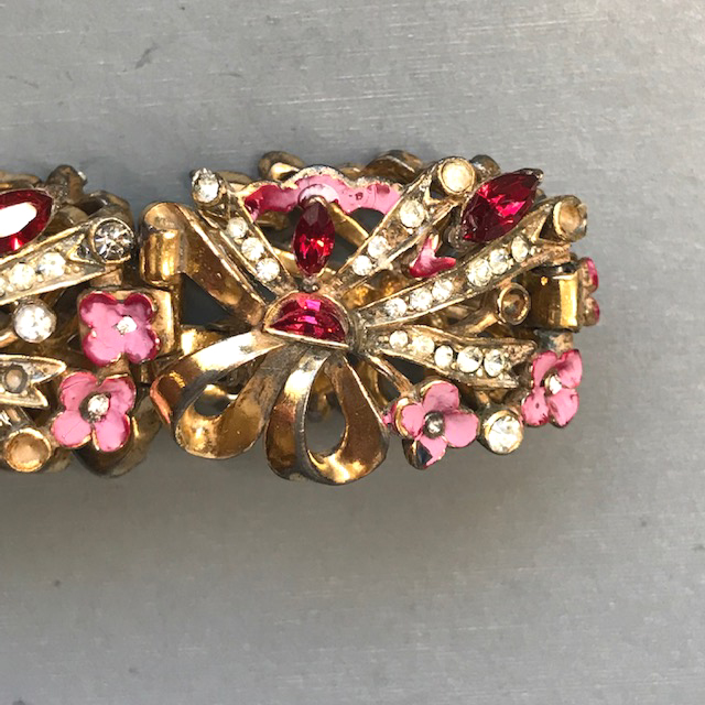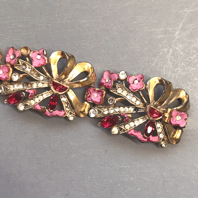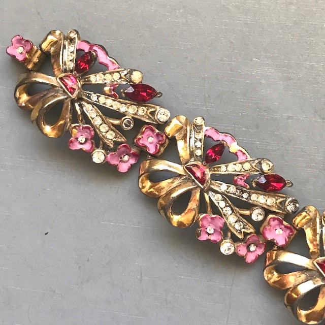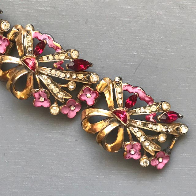 BRACELET pink and red enameled flower links bracelet decorated by red demi-lune rhinestonesProduct #43035 All items in excellent vintage condition unless otherwise noted.
