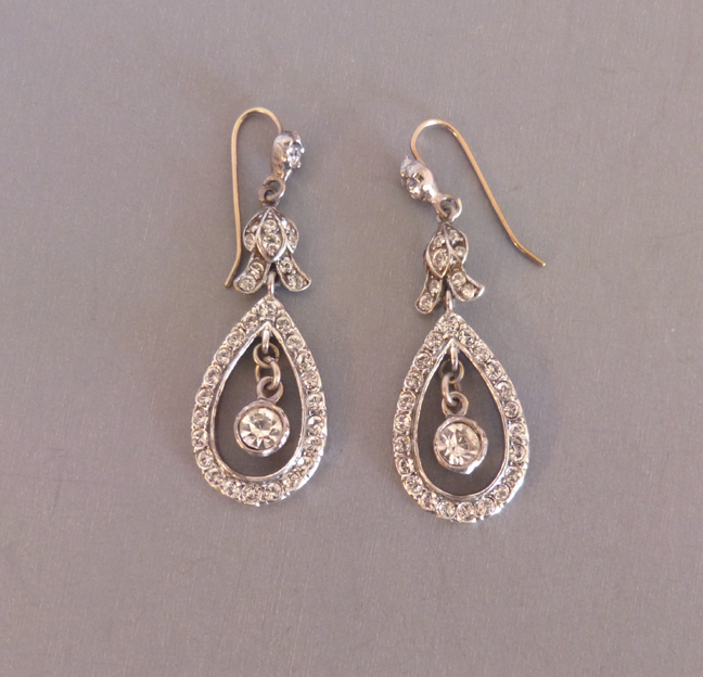 BRILLIANT clear rhinestone or paste pendant style earrings for pierced ears, set in silver with gold shepherds shaped wires, circa 1910 European