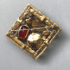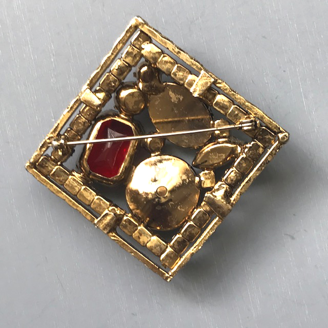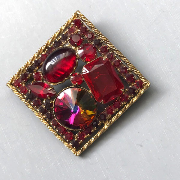 Description BRILLIANT and beautiful red and purple rivoli, rhinestones and cabochons in a square brooch with a gold plated setting, late 1960s, 1-7/8" by 1/7/8". The stones remind me of Juliana jewelry.