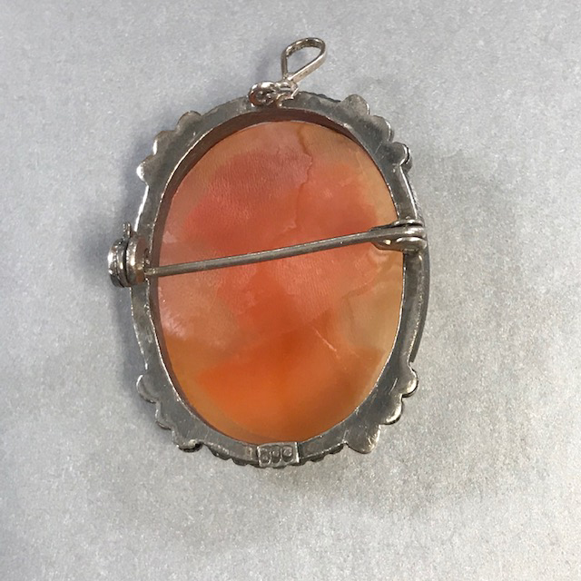 CAMEO brooch with a carved sea shell lady profile, and she wears wheat sheaves in her hair, set in 800 silver it has a loop for a chainProduct #41561 All items in excellent vintage condition unless otherwise noted.