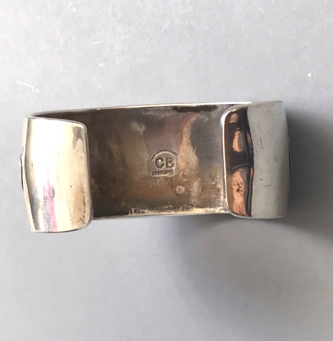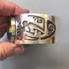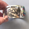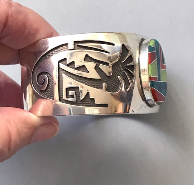 CHARLIE BOWIE Native American sterling silver bracelet with turquoise, gaspeite and coral inlay, and an overlay KokopelliProduct #41895 All items in excellent vintage condition unless otherwise noted.