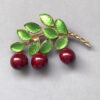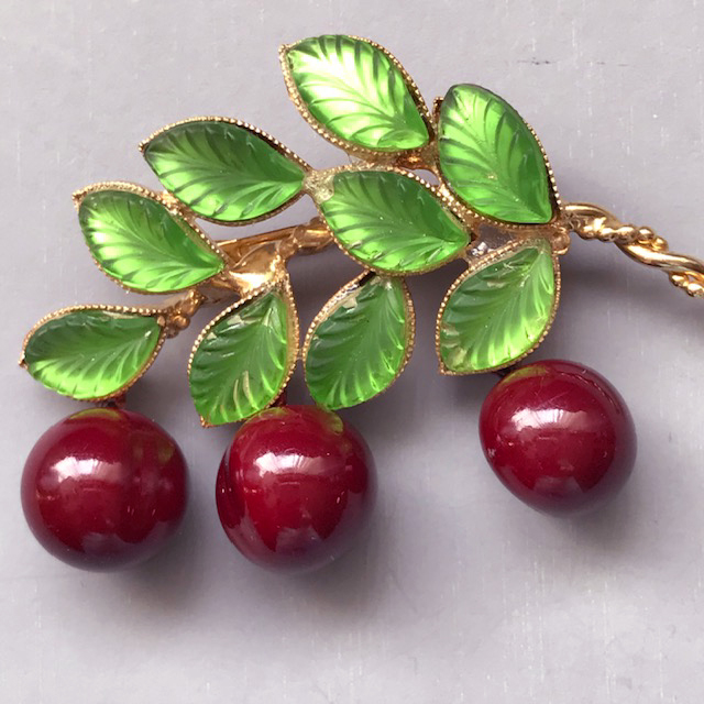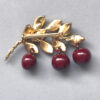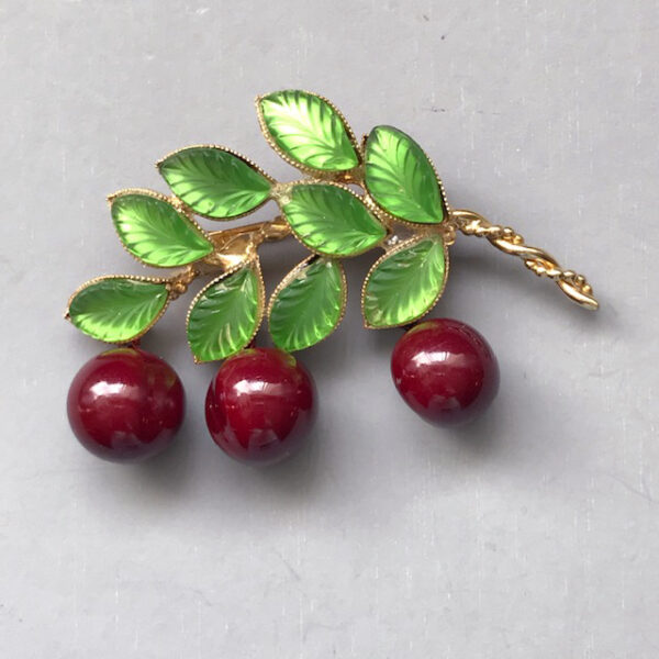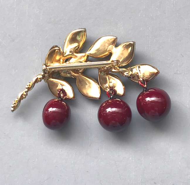 Description CHERRY red cherries brooch, Schreiner, Hobe and Hattie Carnegie used these same beautiful pressed glass frosted green leaves which highlight the cherries of rich red enamel on glass, all in a gold plated setting. The brooch is 2-3/4" by 2", and each cherry is 1/2" across. These luminous pressed glass leaves are some of my favorite elements and they were used by more than one jewelry company including names like Schreiner, Hobe and Hattie Carnegie, as well as in unsigned pieces like this one. To see some of the others, click HERE. View View Product #41979