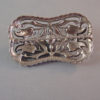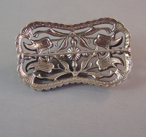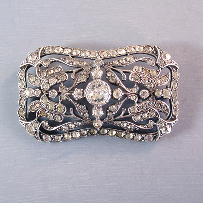 CLEAR paste rhinestones rectangular brooch with a lovely pierced design and clear rhinestones in a silver settingView Product #Q37985 All items in excellent vintage condition unless otherwise noted.