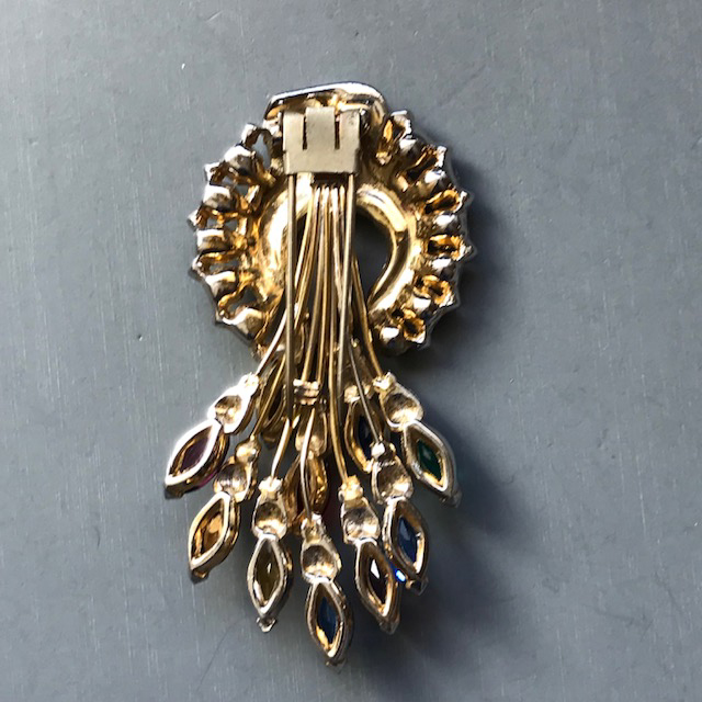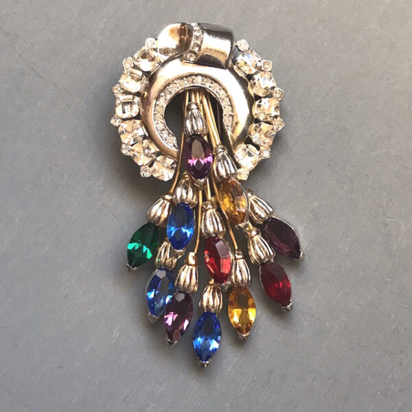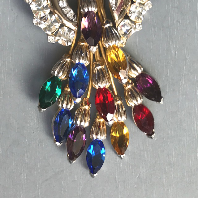 COLORFUL rhinestone spray fur clip with a rainbow of red, purple, green, blue and topaz colored marquis cascading from the top circle