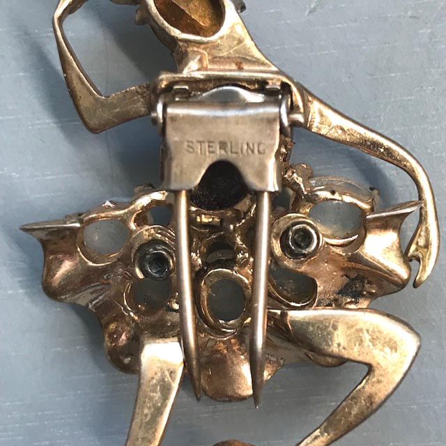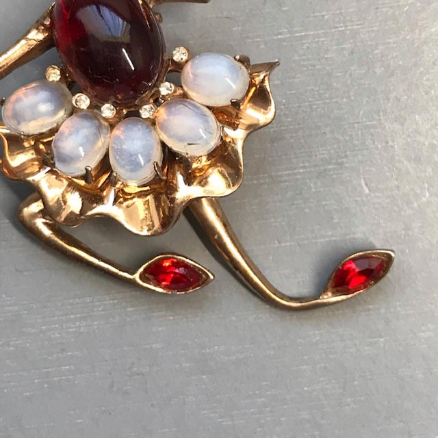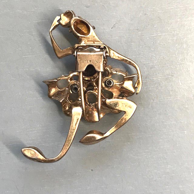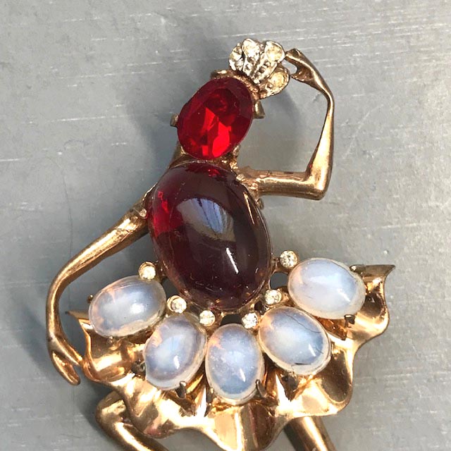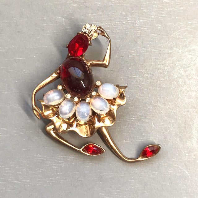 Description CORO ballerina dancer fur clip with red glass cabochons and rhinestones, opalescent oval cabochons and tiny sparkling clear rhinestones, all in a gold plated sterling silver setting.
