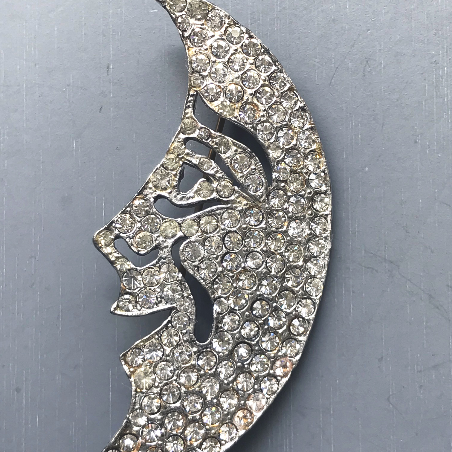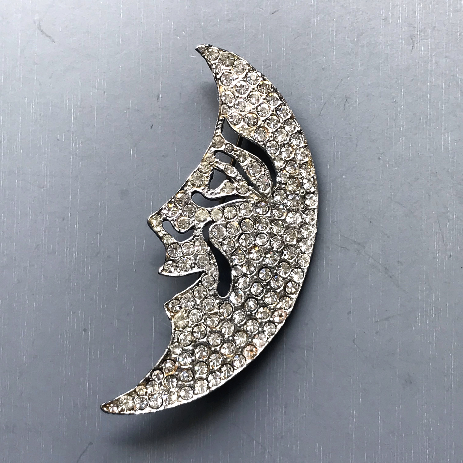 DescriptionCRESCENT man in the moon brooch with clear rhinestones in a silver colored metal setting, 3" by 1-1/4". His grin is absolutely charming! ViewView View View Product #42742