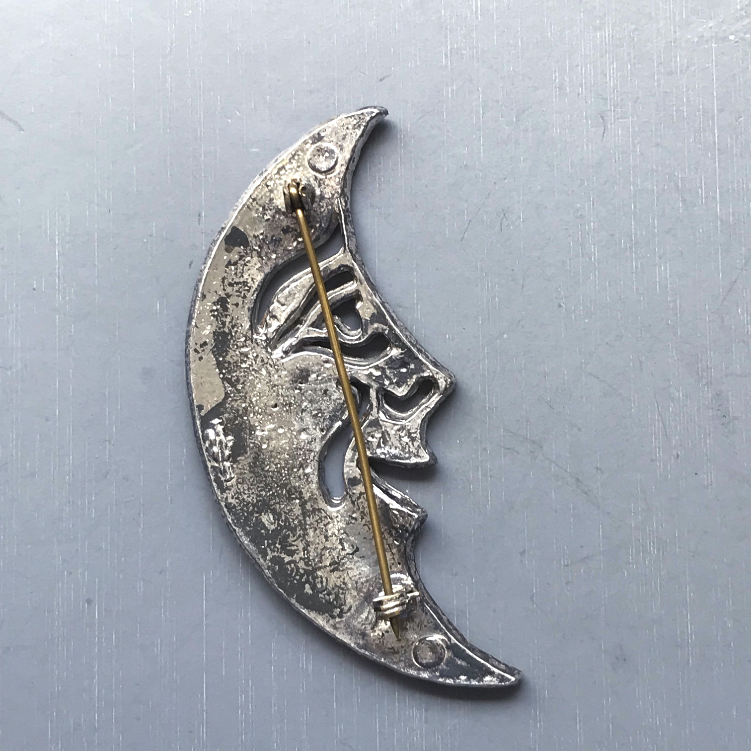 CRESCENT man in the moon brooch with clear rhinestone, big smile!