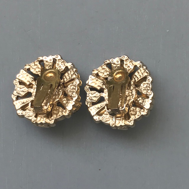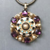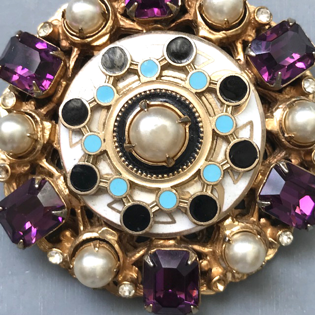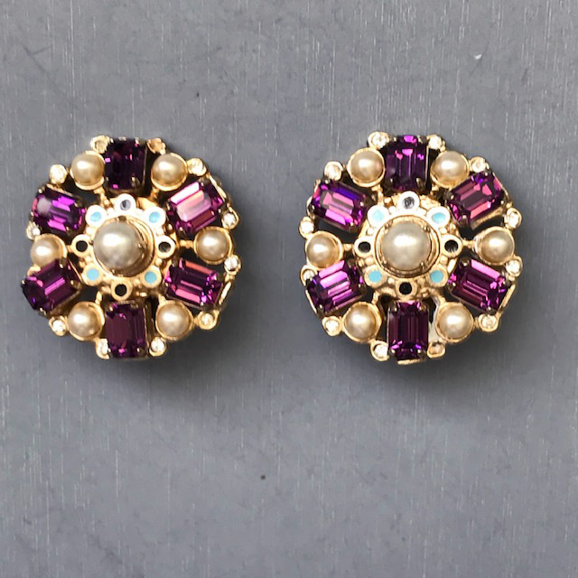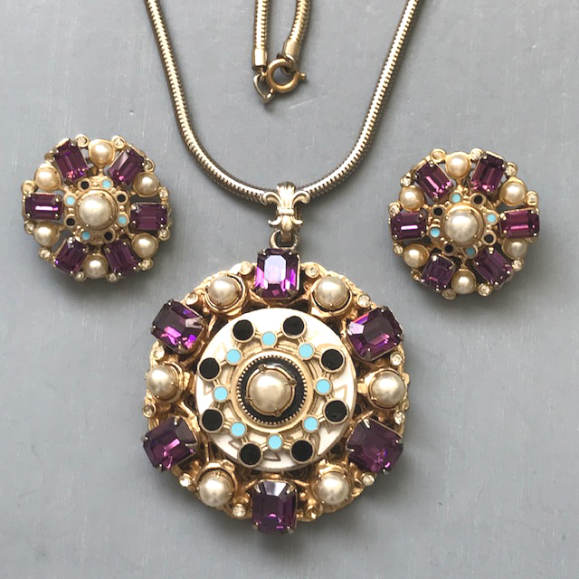 CZECH design influenced pendant necklace, chain and earrings with gorgeous purple rhinestones, glass pearls, and blue, black and white enamelProduct #42237 All items in excellent vintage condition unless otherwise noted.