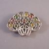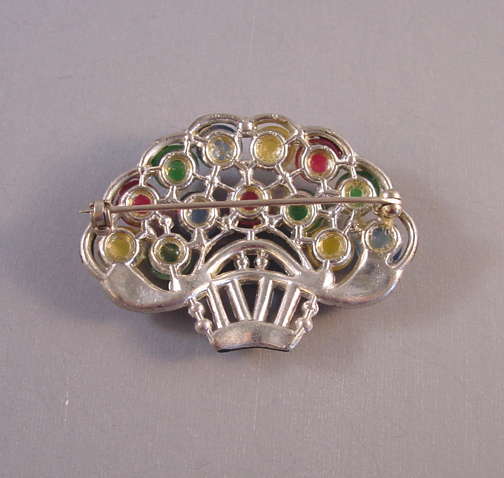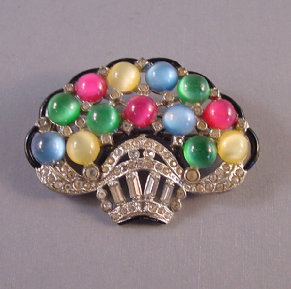 DescriptionDECO basket brooch with colorful moonglow cabochons and black enameled edges all set in silver tone with clear rhinestones. Made in the 1930s, it is 2" by 1-1/2". A very nice lady tells me that this may have been made by the New England Glass Company, but it has no signature. I enjoy wearing baskets singly or in groups of three, and this is a particularly lovely one.