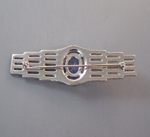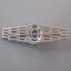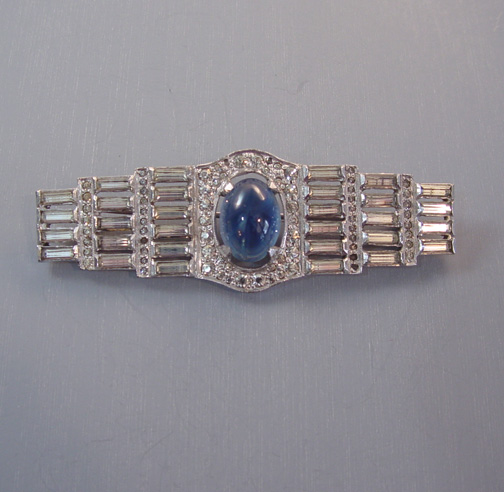 DescriptionDECO style brooch in silver with a blue glass cabochon rhinestone center, rows of baguettes and clear rhinestones, a wide brooch set in silver tone, 2-7/8" by 1". View Product #Y36693