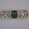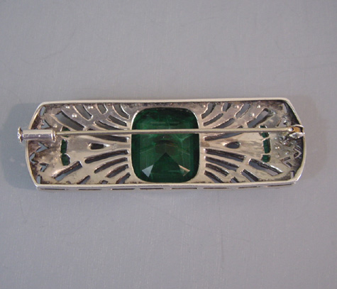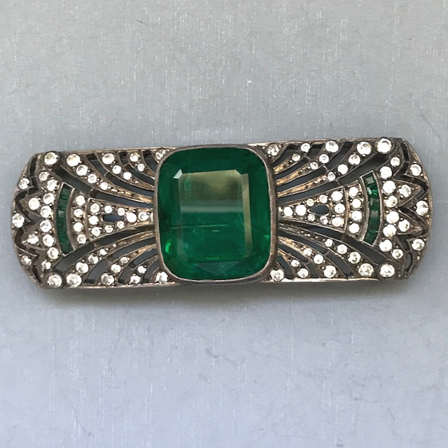 DECO French paste and sterling silver brooch with a large richly emerald colored faceted glass center stone and clear and green pastesView Product #36629 All items in excellent vintage condition unless otherwise noted.