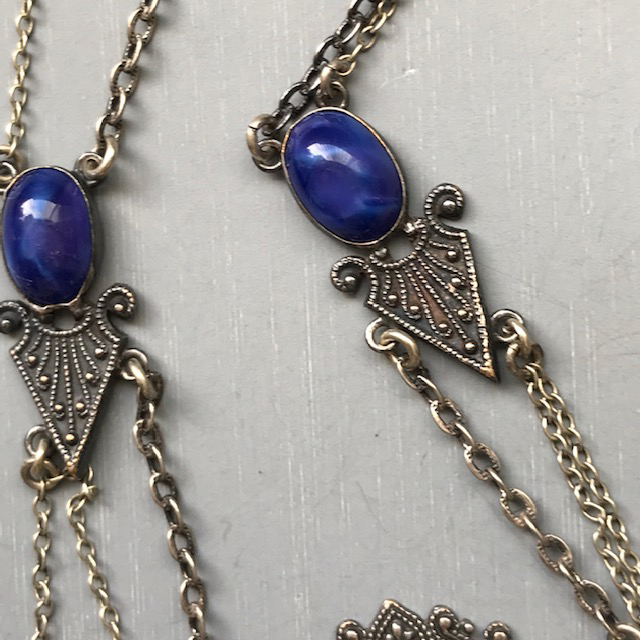 DECO style necklace with lapis blue colored glass cabochons set in silver